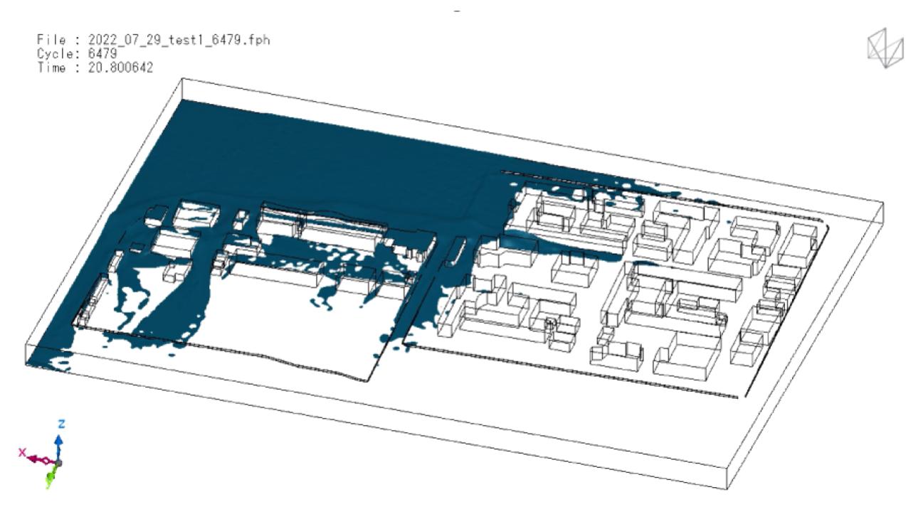 ちょうど未来デザイン・工学機構の異分野融合プロジェクト「KYOTO AGORA」のなかで構成されたメタバース・チームで、デジタルKIT(京都工芸繊維大学)をつくろうということになり、初めは部屋の画像を全部撮ろうとしてたんです。予算やデータ量の関係でそこまでは叶いませんでしたが、本来はすべて撮って、学内のすべての空間をデジタル化しようとしました。それから小野先生の提案で、洪水を想定して水を流してみたんです。どこから水が入るのか、流れ始める時間がいつなのかを推測できるようにしました。